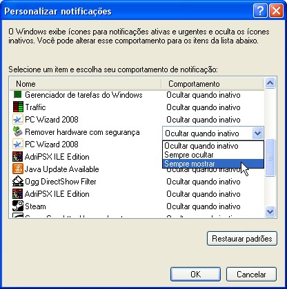 3-No menu de personalização, procure por Remover hardware com segurança, e na lista à sua direita, escolha a opção Sempre mostrar.